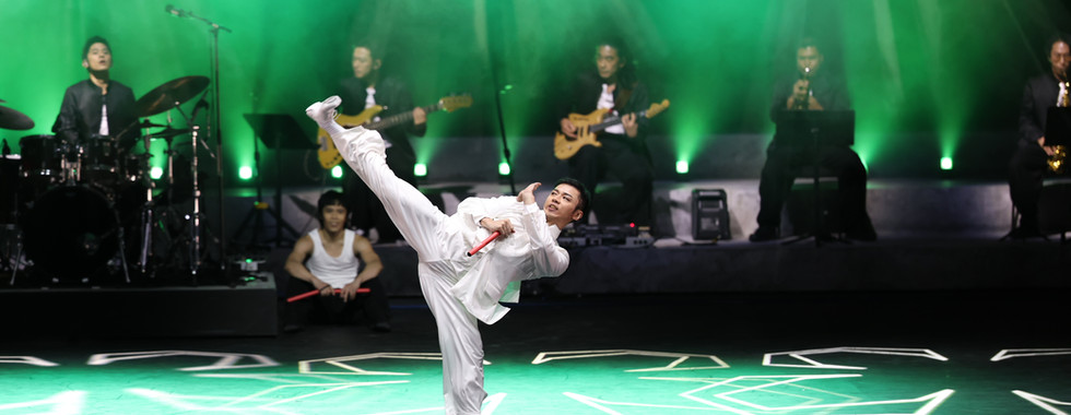 The Epilogue, The Legend, is a grand group sequence demonstrating the accomplishments of the company’s dancers, who have undergone constant martial arts training for the past eight years. Dressed in smart white Chinese tunic suits, every dancer, no matter male or female, is manipulating red nunchakus while moving and dancing to live jazz music. The band plays the energetic theme song from Lee’s The Way of the Dragon (1972), composed by Joseph Koo, with additional musicians: Clem Fung (guitarist), Ferdinand Pantig Jr (trumpetist) and Yu Hagiwara (saxophonist). Thousands of photos of Lee, at different stages of his life, are displayed above and along both side of the stage. This leads the audience through a time tunnel to witness his achievements. The LED lighting is fascinating and nostalgic with different patterns glowing on the floor. Despite one of the female dancers dropping the nunchaku during a fast movement, her calm, swift reaction in picking it up for continuity demonstrated the artist’s professionalism in handling an unexpected hitch. This dance with nunchakus is exceptionally impressive and stunning in its uniqueness.