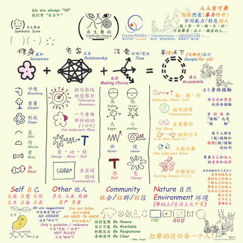 2012年初,我赴南美完成舞動所能(DanceAbility)證書課程,成為亞洲首個華人舞動所能認證教師,同年獲北京瓷娃娃罕見病關愛中心邀請,在他們舉辦的7天「I CAN協力營」中,每天下午進行四個小時的共生舞蹈工作坊,並在最後一天進行演出。這個契機逐漸促成三十小時共生舞基本課程的雛型(相等於香港共生舞團十個月的舞聚時間),當中除「漢化」教學語言之外,為了讓學員更易記得如何進入即興狀態,我將「修身、齊家、治覺、平天下」配用到方法裡,後來並加入Nancy Stark Smith的潛動譜(Underscore),成為一套 「共生舞譜」(見圖)。香港演藝學院主修編舞及舞蹈導演畢業的Mimi在2014年也成為舞動所能認證教師,我們倆都覺得唯有舞動所能是真真正正的人皆可舞,皆因這個發展自接觸即興的舞動方式真正容許一切的不同,而所有舞蹈教育工作者(不只共融)都應該學習一下,正如無障礙意識應該人人皆知皆有。