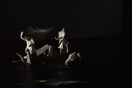 筆者較喜愛開場第一幕那低重心、貼地面的動作語彙。所有舞者以緩慢的節奏模擬海潮的律動,同時散發出大石翻滾的厚重感。在視覺層面,所見的是舞者表現力的延伸,凝聚與擴散的轉換,特別是當身體融入投影的光霧中時,更構築出一種動態的詩意。隨後的兩幕,不論群舞或雙人舞,舞者的肢體語言皆在空間與節奏中充分展開。肩胛與骨盆彷似蛇身般擺動,互相抗衡的旋轉質感很吸睛。舞者既像捕捉能量的流動,又如同理舞伴的感情。另一方面,編舞的位移設計亦具心思。在最後兩幕中,LED屏幕於舞台的深度與廣度間的移動,既拓展了敘事層次,更象徵著人際情感或關係的逃避和追問。