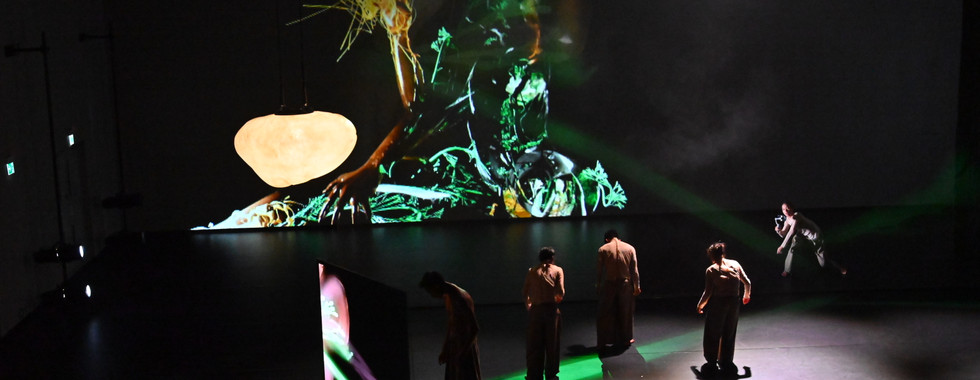 混雜 (hybridity) 的概念縱貫全場,聲音景觀的設計營造出一種似曾相識的氛圍。華人與東南亞音色的傳統樂器和人聲,帶來延宕的的熟悉感,而合成器的音聲則反襯出冰冷的疏離。就感官層面而言,最後一幕格外具挑戰性。演算法生成的「數碼植物人體」投影,彷彿是血肉與虛擬之間的迴響。這份陌生感並非單純的異化,反而消化下來,倒像一種親切的呼喚,邀請我們開啟對數碼仿生舞蹈美學的想像,並思索人類特質在數碼時代如何與人、與自然、與科技共存共活。